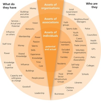 - It provides a visual description of the assets and the relationships that exist and those that have potential between organizations, groups and people within the community.